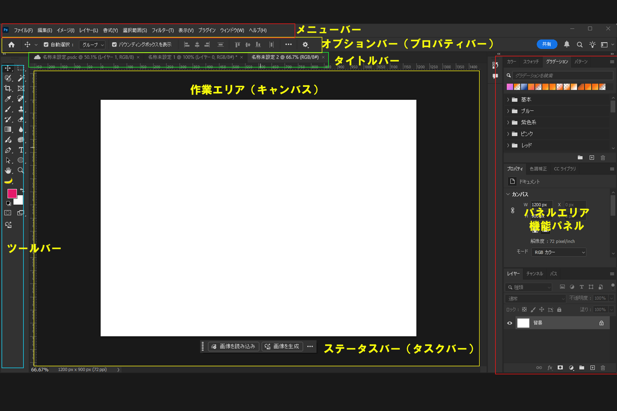 - タイトルバー:現在開いているファイル名や倍率などが表示されます: