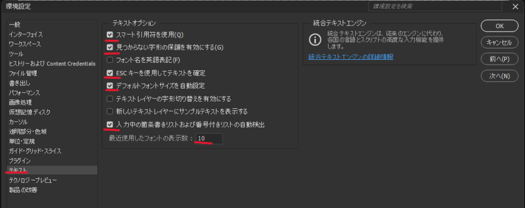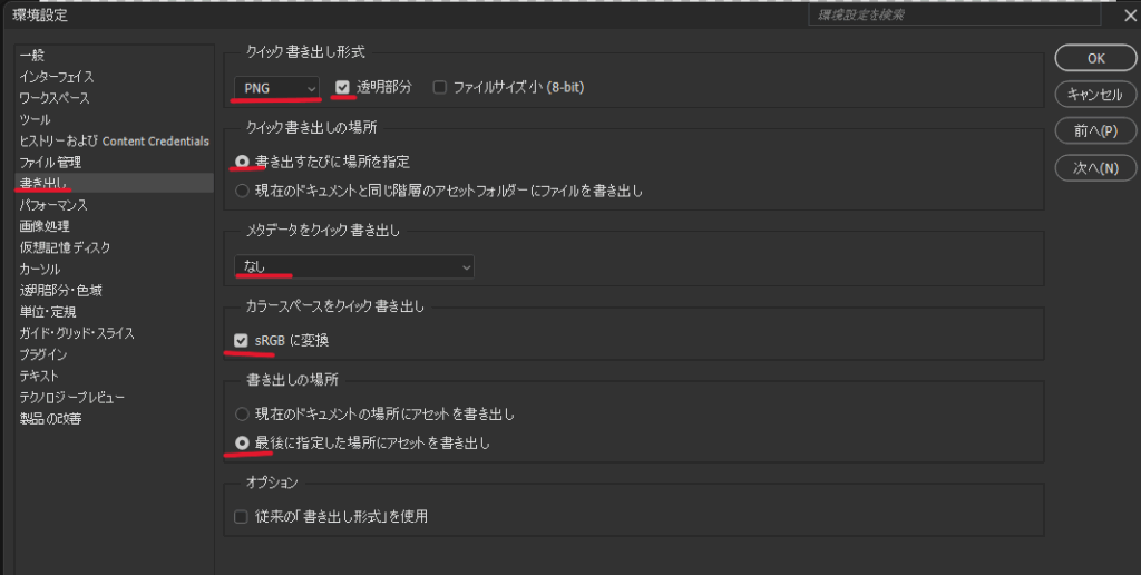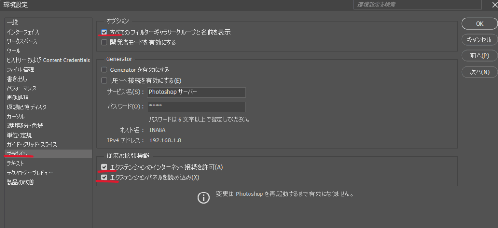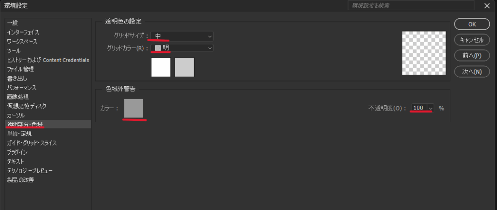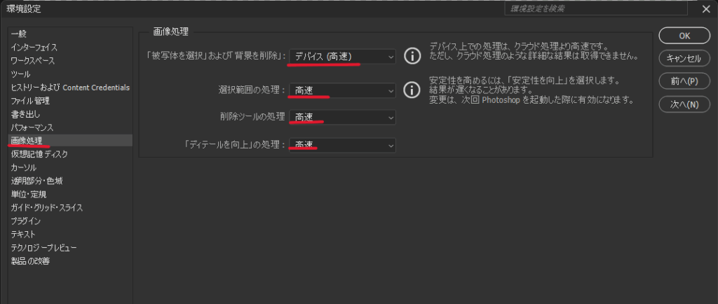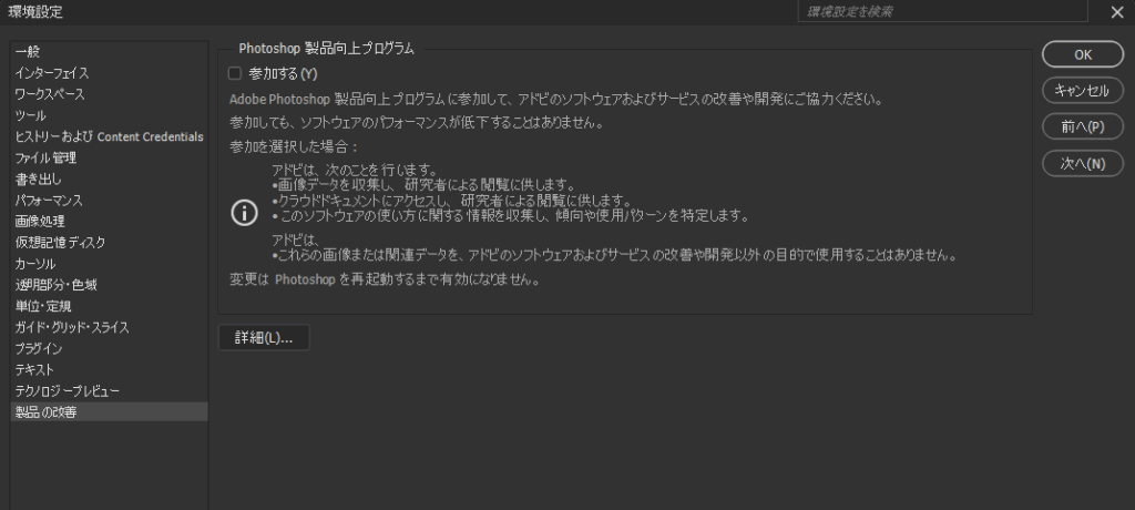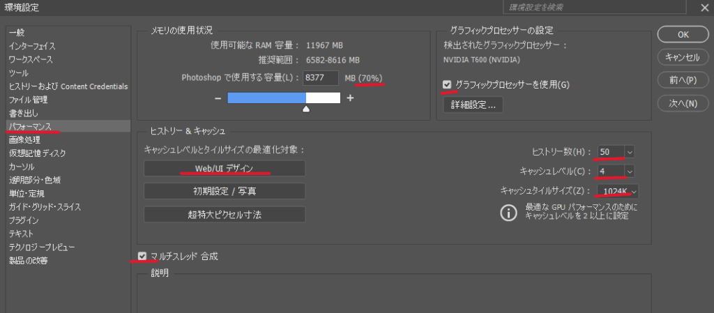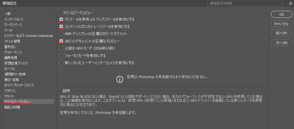 - アクセス方法:Windowsでは「編集」→「環境設定」、Macでは「Photoshop」→「環境設定」から各種設定が可能です。