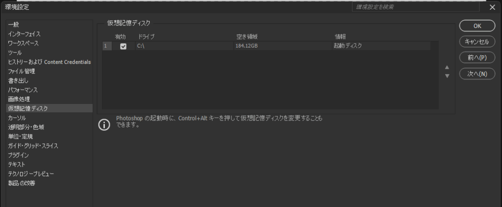 ④ スクラッチディスク(仮想記憶ディスク)の設定を確認