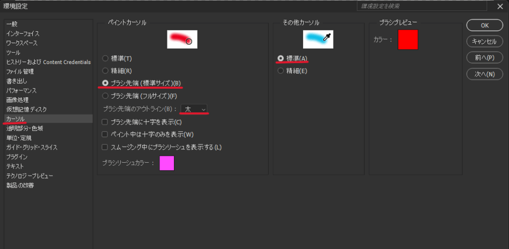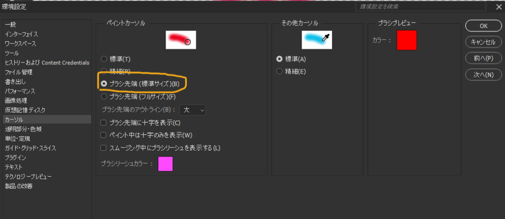 ブラシなどのカーソルの表示スタイル(例:標準、精細、ブラシ先端)を設定できます。