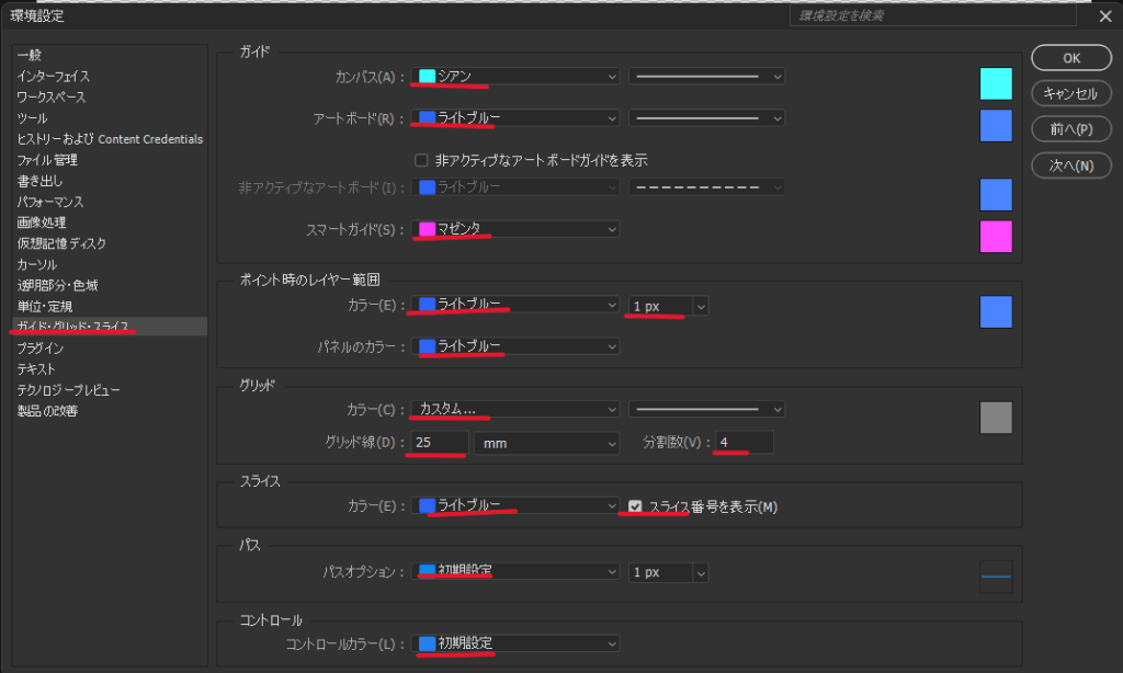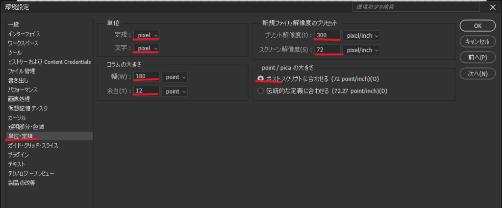 → 単位を「ピクセル」にする、ガイドやグリッドを表示するなど、自分の作業スタイルに合わせます。 - ミスやトラブルを防ぐため