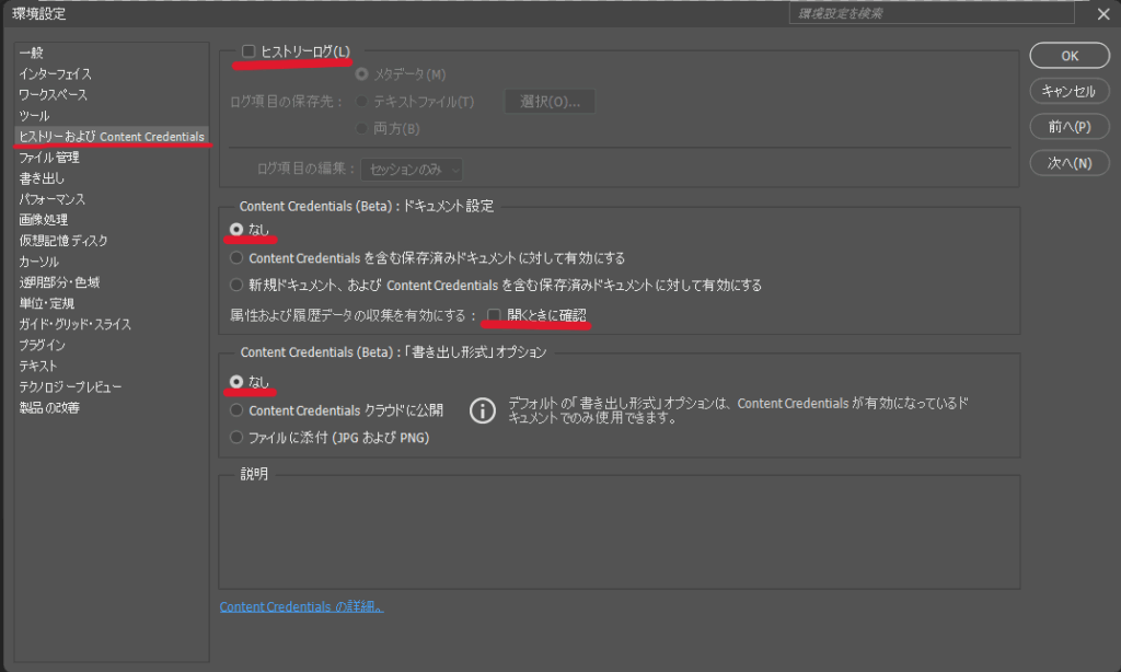 ⑤ Photoshop「ヒストリー及びContent Credentials」